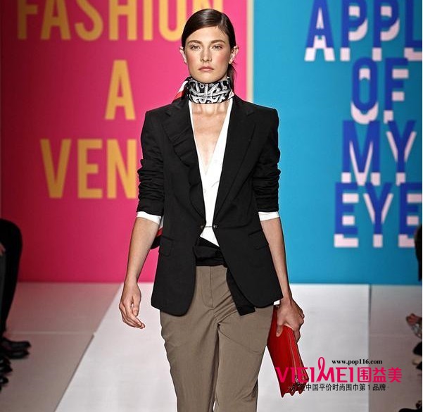 春夏女装设计走起轻熟女路线,小丝巾有效的帮助丰富造型。丝巾的用法上要先折叠成条状,再一丝不苟的围着脖子缠绕起来,规规矩矩的造型和服装搭配的正式感保持一致。