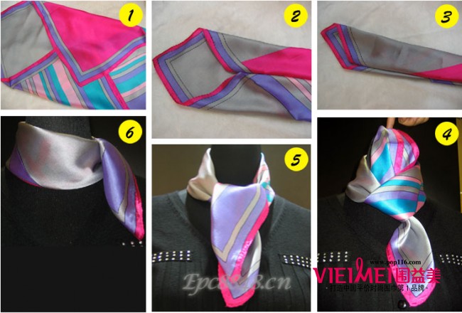 3&4.将折好的丝巾围在脖子上,将风琴折的一端穿过另一端的结整理成形。