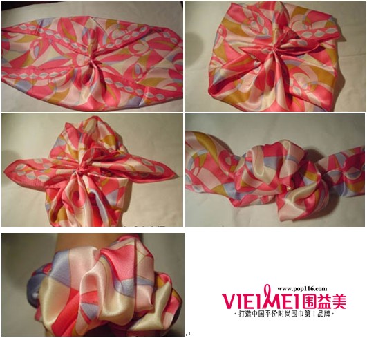 1&2&3&4.将长巾随意对折成长条形并在一端打个结,调整活结在头上的位置,整理成形。