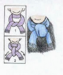 step 1:把围巾交叉绕在脖子上,左边在上,然后将右边那段沿箭头方向穿过空隙