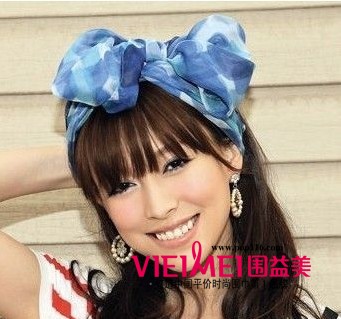 清新甜美风:齐刘海长卷发mix蓝色扎染头巾