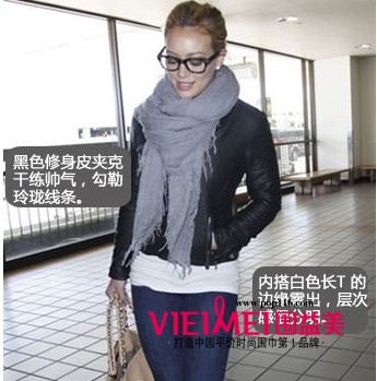 同样黑色系的针织围巾,协调了整身装扮,流苏的花边在步履中增加了层次感,蓝绿色外套非常亮眼,不会让整个身体淹没在人群中。
