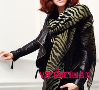 豹纹围巾野性搭配皮衣显出酷酷的风格!随意的交叉披在肩上展示个性不羁!俨然一位个性丽人!