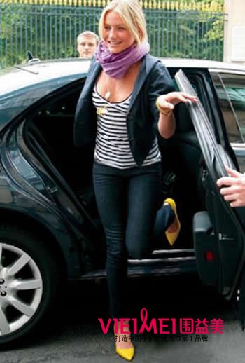 丝巾和鞋子的对比搭配是全身的亮点,如果暂时把握不好大面积的亮色搭配,这种丝巾和鞋子的小面积对比搭配是最好的选择。