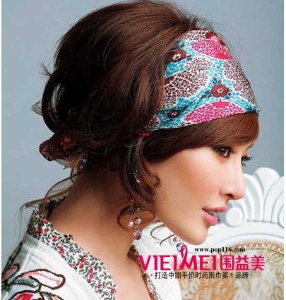 搭配建议:将丝巾对折成大三角,裹住头部及前额的一部分,两角在颈后交叉打结,再次交叉后系好,整理造型,让秀发同丝带一起自然下垂。