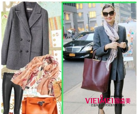 Miranda Kerr:毛呢外套+花色围巾。辣妈可儿最近风头正劲,每次出街都成为众人的焦点!灰色系毛呢外套配搭黑色皮裤,时尚显嫩,粉色系花色图案围巾更是给整体造型带来靓丽色彩,成为造型亮点!