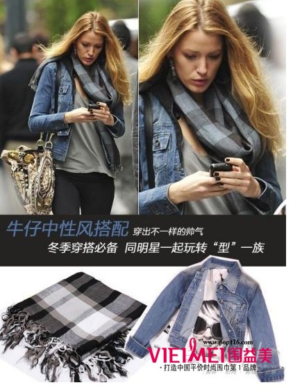 羊毛围巾、编织围脖、印花领巾...眼花缭乱的颈间配饰让人心动,保暖的同时又可以穿搭出层次感。跟明星们一起学搭配一定能用得出彩?围脖也是冬季穿搭最必不可少的配饰之一,时尚达人最新流行的领结搭配也是冬季穿搭最必不可少的配饰,让你也能轻松玩转冬日小物,变成“型”一族。 牛仔搭配格子围脖随性的中性风,蓝色的牛仔给人以随和的感觉,保暖的同时又好有型,欧美时尚人士十分爱!