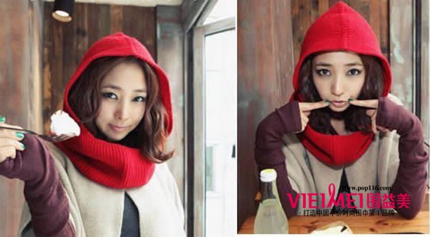 红色的套头围脖不仅保暖,而且方便脱戴。可以当普通的围脖,也可以拉起帽子,这样不仅温暖脖子,同时也让头部免受风寒。大红的颜色与冬天素色或是色彩暗淡的衣服搭配都十分经典哦!