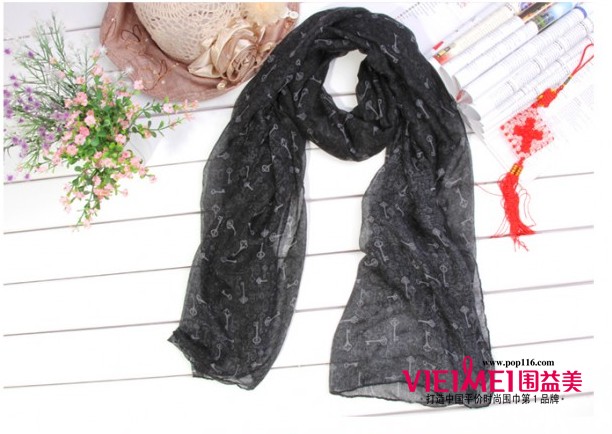 编辑点评:具有防紫外线功能的夏季真丝长丝巾,浅灰色的图案最适合白色的衣服,如白色衬衫,白色背心等。
