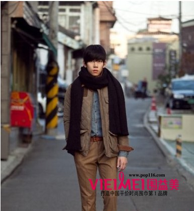 3.帅性搭配原则。比如一位年轻男士身着一身帅性的外套,在脖颈处缠绕几圈用长细毛线编织的围巾,有种知性美,同时散发出温暖的感觉。