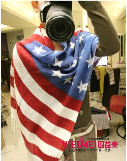 美国国旗图案的一款围巾,是今冬流行围巾之一,怎么围好看,其实很简单,随意的当做披肩搭配就可以了!