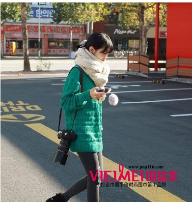 糖果绿色的粗棒针毛衫搭配一条米色的毛线围巾,简约却不失亮丽甜美的风格,而灰色的紧身裤搭配黑色雪地靴,也非常显瘦。