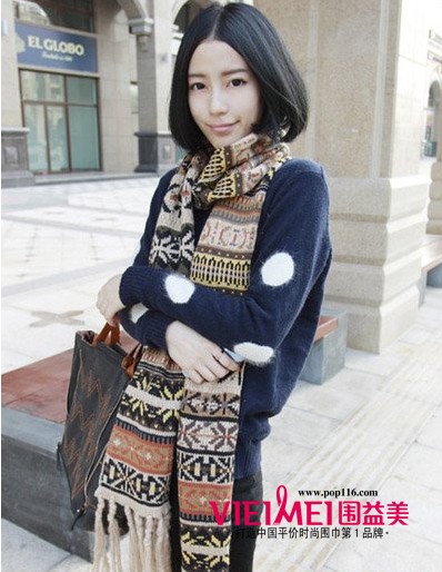 暖色系的波西米亚风格围巾,配上飘摆的流苏设计更生动。穿上藏蓝色的毛衣搭配今冬最流行的围巾,休闲的街头美感立现。