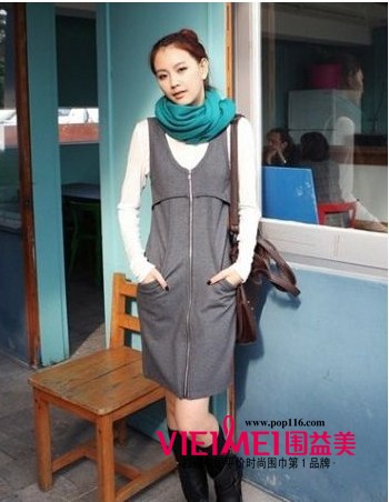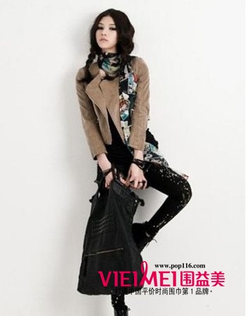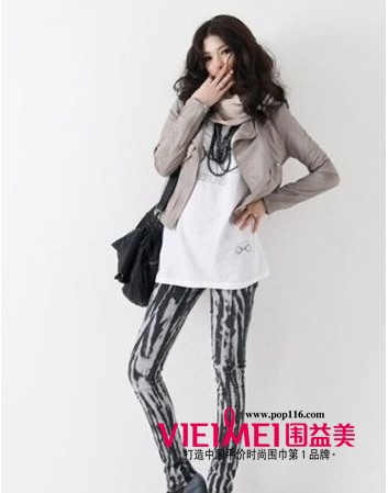 相信MM们在看欧美明星街拍的时候已经看到无数明星示范这种形态的围巾,搭配方法非常随意,但都能表达出另一种气质,米色调跟短外套呼应的恰到好处,搭上扎染效果的打底裤更显时尚前卫。