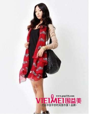 红色给人的感觉有份别致的俏皮和轻佻,显得相当有女人味儿,而灰色印花则让你不会显得过分浮夸,可见一条围巾也是很考验人的品味的哦!