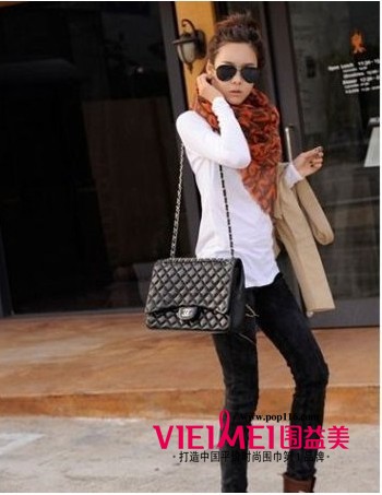 写意印花绝对大热,个性的照片图案印在围巾上显得非常特别,有点复古的感觉,加上软皮外套跟修身漆点裤,更显性感魅力。