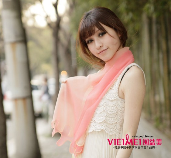 粉色代表温柔,佩戴一款粉色丝巾,总让人不禁多了一份淡淡的喜悦,扯得知识面一点,粉色可以缓解人的情绪。