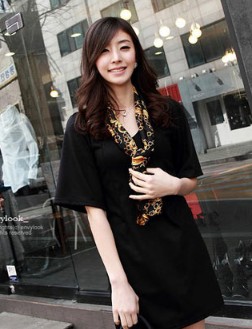这种领带式的打法在中性之中反衬了女性美,搭配黑色连衣裙,打造成熟气质美女