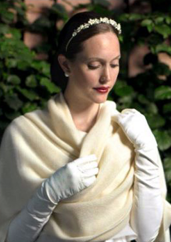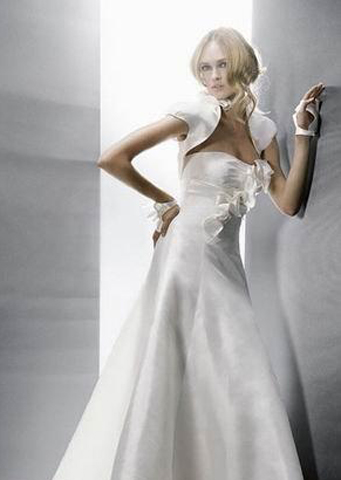 围裹式--大的方型或较宽的长形婚纱披肩或是开叉式的婚纱披肩适合这种穿法。用婚纱披肩围裹住肩部与手臂。这种穿法可以表现出你自然、惬意与恬静的神情