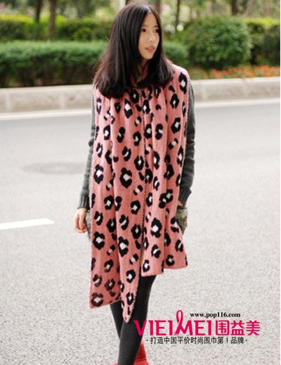 粉色的豹纹披肩搭配灰色的上衣和打底裤,一双红色的雪地靴十分抢眼