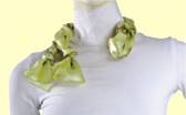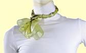 利用美丽的丝巾结成花状系在颈侧,不仅使脸庞增色,造型也更具立体感,达到画龙点晴的效果。建议最好选用质地轻柔的浅色调丝巾,将丝巾系得稍斜一点效果会更好。