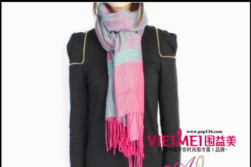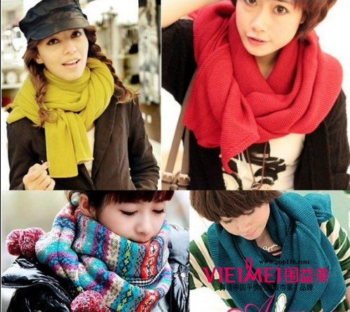 韩式双层结展示:毛呢面料的花色围巾。更加保暖也为冬季装扮增加了亮色,有流苏或毛线球装饰的围巾,会更显甜美可爱的味道。