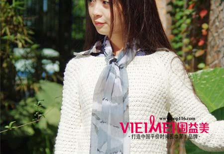 小编点评:这款素色的丝巾,独有魅力,搭配针织衫很有时尚的味道,系法很怀旧,还记得小学时候系红领巾吗!