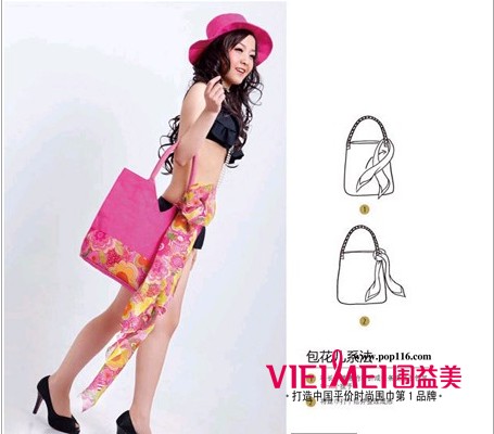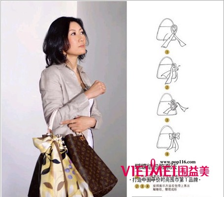长款丝巾的N种系法 扮靓春季有妙招 小编点评:时下最流行的一种系法,将丝巾系在包包上,既能增加包包美感又能凸显女性的品味与气质。