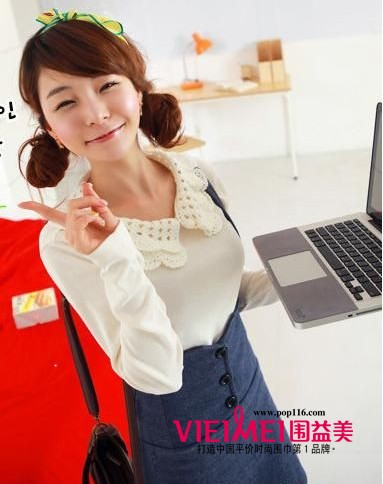淑女气质的白色棉质镂空领小衫搭配高腰筒裙,像发带一样绑在头部的丝巾与两个可爱的小发髻相衬,映衬出俏皮与活力