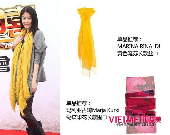 同样身着简单灰色针织上衣的陈慧琳搭配了一条明亮的黄色流苏长丝巾,黑色长裤和同色系短靴都显得成熟干练,而流苏这种复古的代表一定能把人带上潮流前端。
