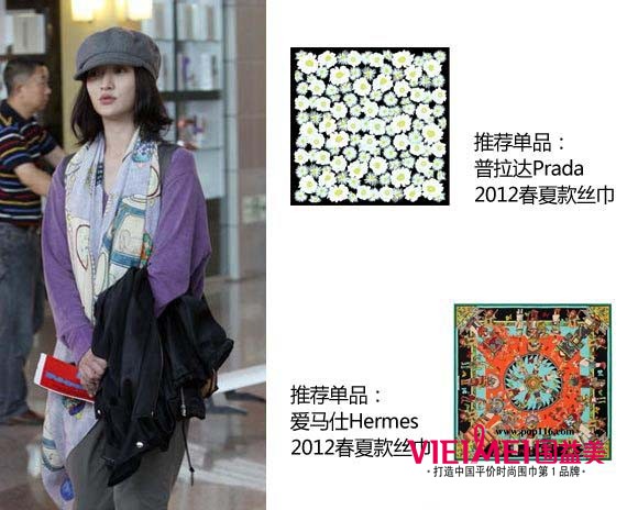 周迅穿着很抢眼的紫色T恤,装扮活脱一个20出头的小女生。复古花纹的爱马仕丝巾随意挂在颈上尤为俏皮,烟灰色贝雷帽与同色系九分裤十分协调,黑色的高帮球鞋和双肩背包显得她朝气十足。
