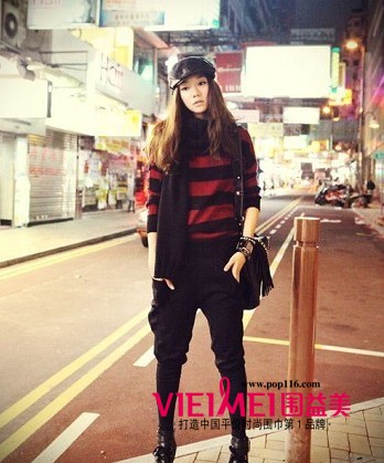 红色×黑色的粗条纹上衣很抢眼,搭配上今年夏天就很流行的韩式长裤,潮味十足,以黑色为主色的搭配非常爽朗有型,成熟的感觉很浓厚!