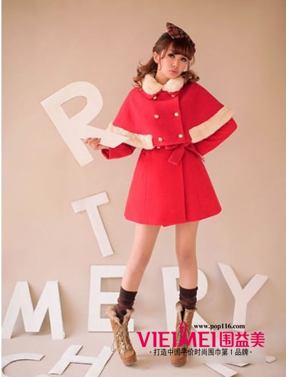 可脱卸毛毛领多WAY圣诞斗篷毛呢大衣