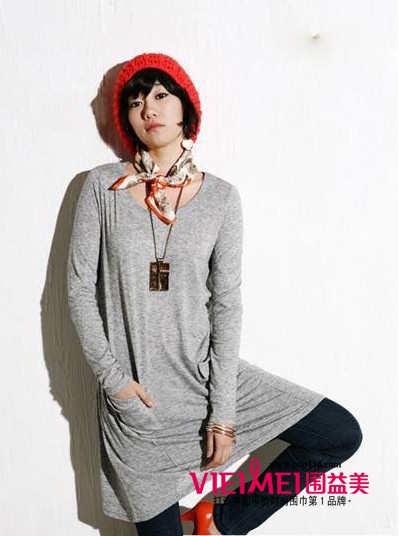 以灰色与红色作为主调的搭配,灰色长T恤搭配蓝色仔裤很显瘦,红色的帽子和高跟鞋很抢眼,当然,丝巾也是同一色系才能和谐构图啦。