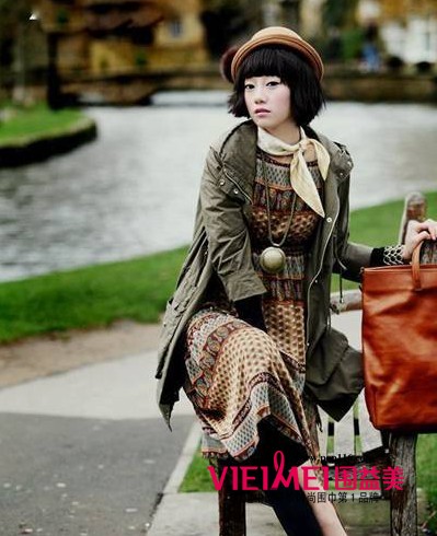 丝巾搭配连衣裙,浅黄色的斜纹小方巾,简单的花纹。搭配带有民族风连衣裙,几何图案和横纹设计都很好看,很有特色,民族风情浓郁,秋日都点凉意,搭配一件很受欢迎的军绿色外套就最适合不过了,低调的外套和简单的丝巾都不会掩盖连衣裙的锋芒