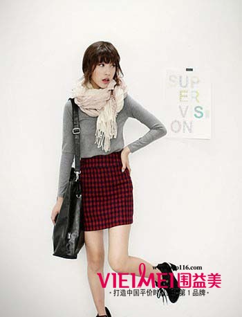 低调的灰色更加凸显出红色调格纹半裙的活泼甜美,完美融合成熟感与甜美度,裸色围巾不仅显得温暖温馨,还能够令造型更加富有层次感,黑色运动风的高跟鞋更是令女孩透出帅气感。