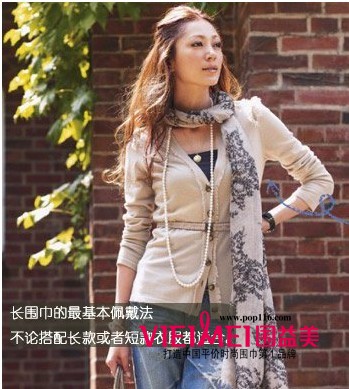 长围巾的佩戴方法有很多,但是为了拉长身形,我们还是选择拉长下摆的方法,但是在北方大风天气较多的地区,还是不建议短款衣服搭配时候使用。