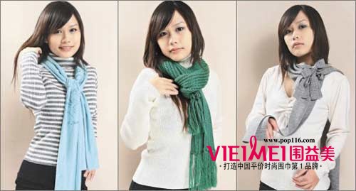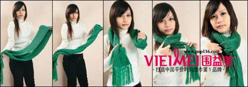 围巾搭配4要诀 1.看材质 毛线类比较适合针织衫,棉质的围巾适合棉质衣衫,厚薄轻重比例才不会太怪。有些更薄的质料如雪纺纱,也要挑材质更软的衣服。 2.看图桉 有些围巾图桉本身就是设计的一环。看清楚围巾上图纹的走向,不需太费神就能达到想要的效果,凸显围巾的特色。 3.看衣服花色 围巾和衣服若是对比色,能让人在视觉上眼睛一亮。素色的围巾适合搭亮眼一点的服装。 4.看发型 短发者或把头发挽起来,可把围巾当做视觉重点,但长头发者建议简单围绕即可。 想要变化一下,可以把长围巾对摺后在胸前简单打个结。不过也有诀窍,方法如下: 1.左手穿过围巾,右手抓着有流苏的一端。 2.左手把围巾像捲麻花般转两圈。 3.围巾从颈后环绕在前方。 4.把有流苏的那端穿过围巾。 5.完成。 直接围绕脖子一圈:这是最常见的长围巾围法,但善用围巾的材质和纹路也可以创造变化。 在围着脖子绕圈的时候不妨稍微转个角度 如上图中这款钩针式的绿色围巾,在围着脖子绕圈的时候不妨稍微转个角度,另一端也能自然垂坠在肩上,原本感觉很厚的围巾就变得很服贴。