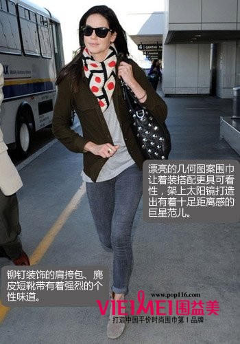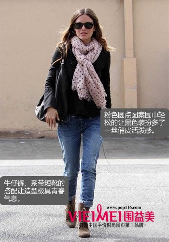 粉色圆点图案围巾 明星示范:Rachel Bilson 轻松俏皮的装扮由一条粉色圆点图案围巾就可以完成,牛仔裤的搭配为街头风格的装扮做了最完美的结语。 豹纹围巾 明星示范:Nicole Richie 半圆镜框的太阳镜、红色内搭衫让全身造型看起来独特又别具趣味。 蕾丝装饰围巾 明星示范:Lindsay Lohan 全身搭配暖意十足,清浅的色调更容易让人产生亲近之感