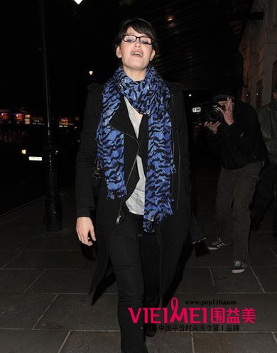 亮宝石蓝底色的斑马纹围巾太过抢眼,所以明星们一致认为,全身都穿黑最保险不会错。杰玛·阿特登 Gemma Arterton这一身相当帅气,内搭浅灰显得透气,加上黑框眼镜,非常完美。