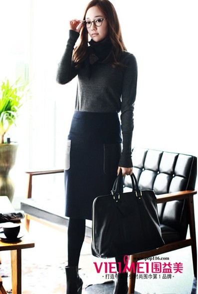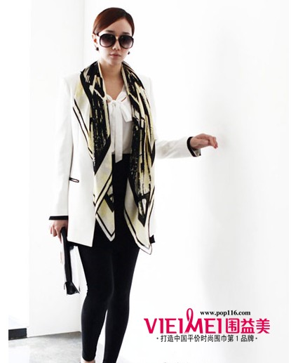 全身黑色容易给人阴沉的印象,增添这一款不规则图案的拼图式方巾即可拥有深浅有致的效果,营造优雅迷人OL装。