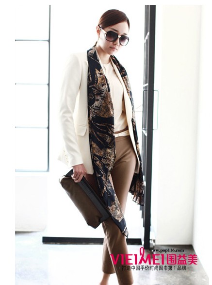 印染泼墨式的设计搭配浅黄绿色的底色,生机灵动的丝巾搭配白色西装外套,和谐且增添女性柔美。