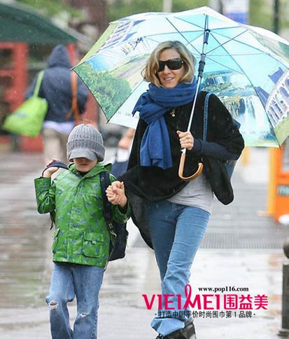 蓝色围巾呼应了牛仔裤的颜色,黑色针织斗篷和短靴带来帅气的中性气质。简单的几个颜色搭配,就打造出莎拉-杰西卡-帕克自在又轻松的穿衣风格。
