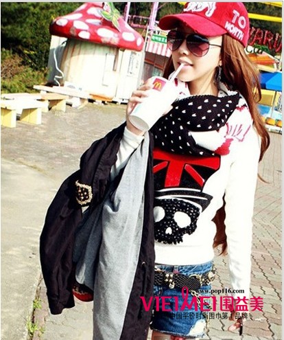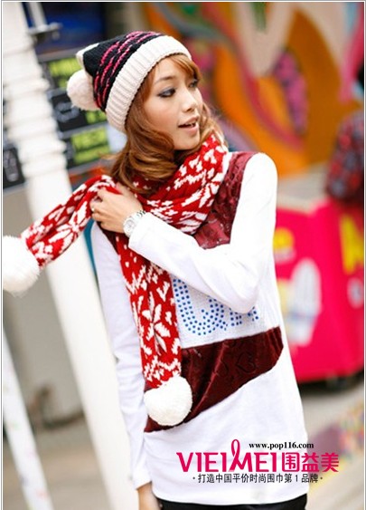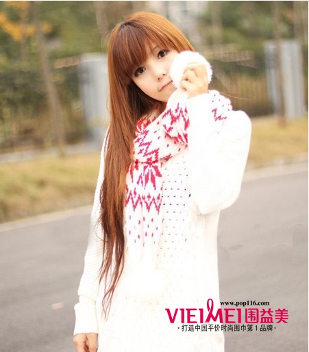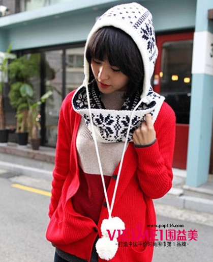 这款时尚保暖的雪花图案毛线围脖,红白色调的搭配,很好的衬托了色彩艳丽的装束。瞬间变身成为街头一族。其头尾部白色毛球的设计,很是可爱,像极了叮当猫的小手手。