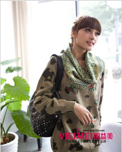 超抢眼的绿色雪花围脖,频添一种新的北欧风情。围脖的大面积绿色与针织衫的小面积深绿色,同色系的搭配相得益彰。