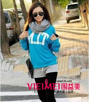 蓝色卫衣搭配灰色短裤、黑色裤袜,太清纯可爱了点?那就搭上浅灰色围巾吧,这样可以让你看起来成熟一点哦!
