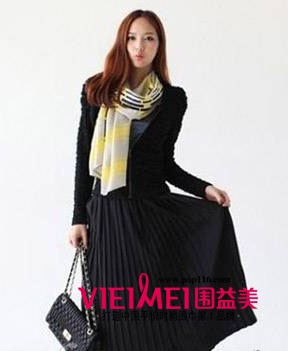 穿纯黑色套装,要显得醒目一些,这款简单一点的围巾自然就是首选了。黑、白、黄条纹图案衬上黑色,简洁干净的配饰,更显优雅!