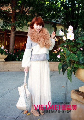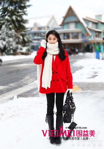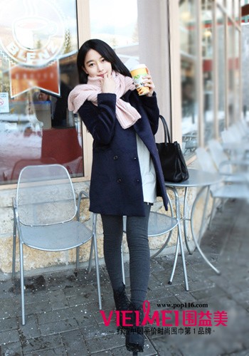 小贴士:羊绒材质轻薄保暖,光泽、手感让每个MM都爱不释手。但往往深色外套总会觉得不够精彩。选条水粉色围脖搭配吧,让你的肩部轮廓更精致小巧呢!