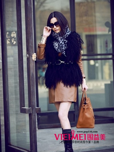 小编点评:小宋佳这款斑马丝巾搭配格外的亮眼,皮衣外套外搭皮草马甲,丝巾巧妙的修饰了脖间那点单调,非常的大气场。