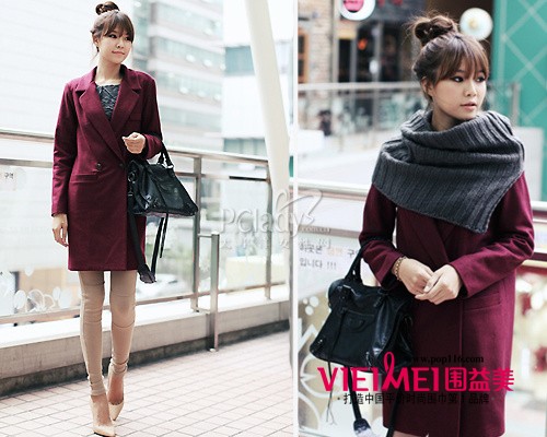 长长的围巾随意的搭在肩上突出单结的蓬松感,给人感觉活泼、积极、热情的印象。样式简单的粗棒针织手感粗糙,装饰效果非常好。搭配修身毛呢外套松紧适度非常有层次。